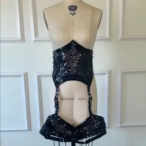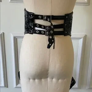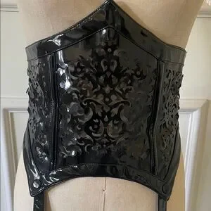 Elevate your style with this elegant black ornate corset belt in women’s XS by Widow. Perfect for adding a touch of seduction to any outfit. The attached thigh garters can be removed.