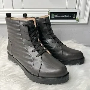 Rain, snow, or shine. This sustainable, water-resistant combat boot always looks on-trend. Water-resistant faux leather upper with a round toe, inside zipper, back pull tab, puffed and padded detailing, and substantial lug sole. Toe box, heel counter, linings, sock foam, and outsole made with recycled materials.