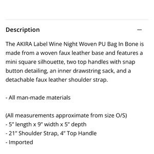 Stylish woven PU bag in bone color. Features a mini square silhouette with top handles and snap button detailing. Includes a removable inner drawstring sack and a removable, adjustable leather shoulder strap. Item on cream and black rug is actual item for sale. There are some discoloration spots in multiple areas on the bag (examples in pictures). I don’t remember ever wearing the bag so I believe it may have come this way. Bought at Akira. No longer for sale.