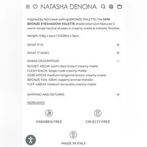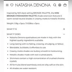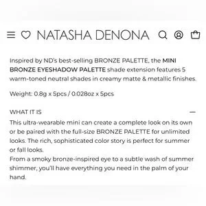 NATASHA DENONA MINI BRONZE EYESHADOW PALETTE ***** NOW RETIRED *****- BRAND NEW in the box! From the best selling bronze palette, this 5 pan mini bronze palette features warm-toned neutral shades in pigmented creamy matte and metallic finishes. This Rick, sophisticated colour story is great for creating summer and fall looks.