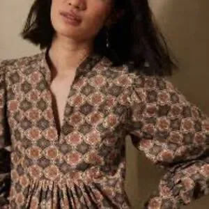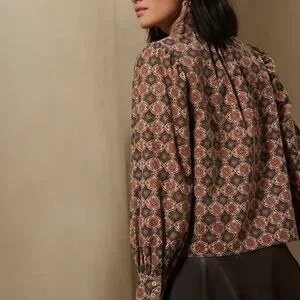 Elevate your wardrobe with this stylish Banana Republic Corduroy Blouse. The blouse features a geometric pattern, V-neckline, and long puff sleeves. It's made of 100% cotton and is machine washable, making it easy to care for. This blouse is perfect for both casual and workwear occasions and is available in size small. The pullover closure and regular fit make it comfortable to wear. It's easy to add a retro touch to your outfit with this peasant top. The blouse is breathable and easy to care for, making it a versatile addition to your wardrobe.