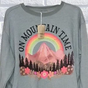 Cozy gray sweetshirt with 'On Mountain Time' graphic. Features a muted color mountain and rainbow design.