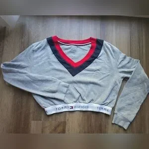 Tommy Hilfiger V-Neck Sweater in Gray with Red and Black Trim
