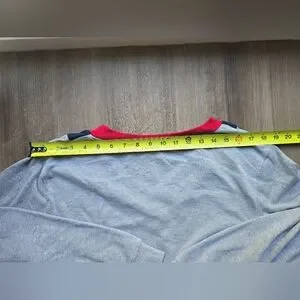 Classic gray sweater with striking red and black V-neck trim. Perfect for casual wear.