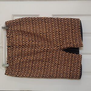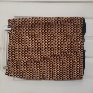 Stylish skirt featuring a geometric pattern in black and tan. Perfect for any occasion. Such a unique color combination! Black, brown, gray, cream, sunny orange and a dusty pink, great for fall, but this fabric/pattern/style works year round! Cotton with a hint of stretch, for a tailored and flattering fit. Fully lined, back vent, belt loops, concealed back zipper. Waist 34" Length 21.5" Excellent condition.