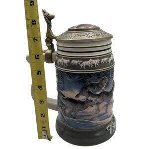 Amidst a serene winter landscape, a pack of wolves races across the snow, captured on this Budweiser stein from the Wolf Pack Series. Designed by Al Agnew, the intricate details and pewter wolf handle bring the scene to life, echoing the wild spirit of these majestic creatures.
