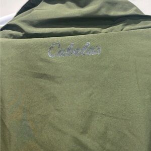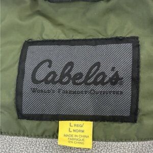 Durable olive green jacket by Cabela's. Ideal for outdoor activities.
