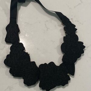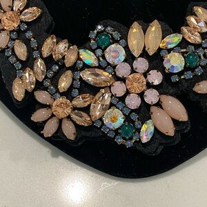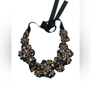 Add a touch of vintage glamour to your look with this floral bib statement necklace, designed with multicolored embellishments and a black ribbon tie closure. The bold bib collar silhouette lays beautifully across the neckline, making it a true statement piece for both everyday wear and special occasions.