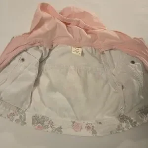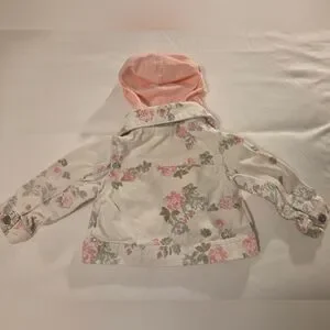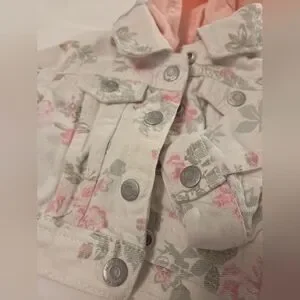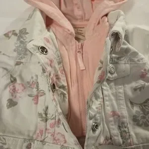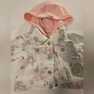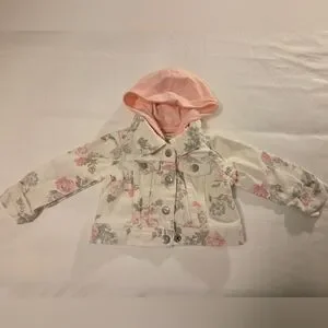 Adorable jean jacket with floral print. Features a soft pink hood. Stylish and comfortable for kids.
