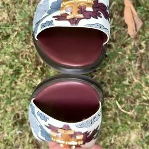 Tory Burch Everly slide. Purple and White Floral sandals. Elegant slides with floral pattern. Comfy footbed. Great used condition. Includes dust bag. Features purple and white with gold logo accent.