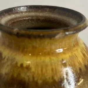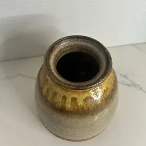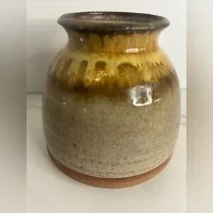 Charming ceramic vase with a rustic brown and cream glaze. Would add wonderful style and texture to any vinaigrette. Perfect for home decor.
