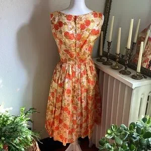Beautiful vintage garden party dress from the 1950s or 1960s in great condition. The fabric features a gorgeous orange, yellow, and gold floral print with a soft brushed cotton or possibly synthetic feel (not fabric tested).