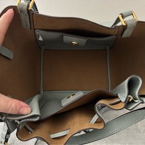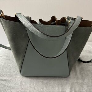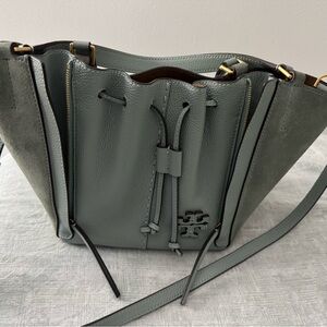 Chic Tory Burch shoulder bag in elegant green leather. Features adjustable strap and signature logo detail. Ideal for versatile styling. Great used condition!