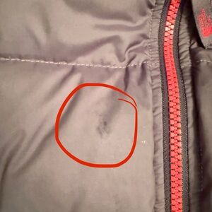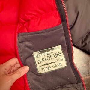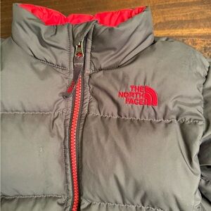 Charcoal puffer jacket with red lining by The North Face - 550 fill down - good condition, slight spot on front pictured above and hole in inner tag