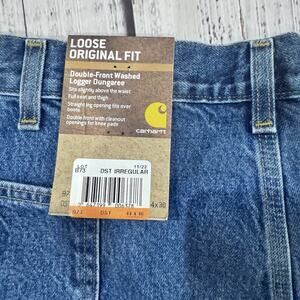 NWT Carhartt B73-DST double-knee carpenter jeans in Dark Stone blue. Original loose fit, straight leg, 100% cotton denim with tool loop, utility pockets, reinforced stitching. Tag 44x30 (measures ~20″ waist flat; inseam ~28″).