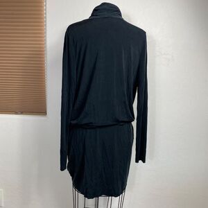 A ALLSAINTS Black mini dress with more than one silhouette . This has to ties that let you change the look of the dress. You can make it longer or shorter. You can make it fit tight or lose. It has a very comfortable stretchy fabric . This goes great with boots , sandals or you could do a over the knee boot in fall and winter.