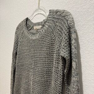 Cozy and classic Pink Rose knit sweater in a neutral gray. Features a chunky knit body with cable knit detailing along the sleeves, crew neckline, ribbed hem/cuffs, and a slightly high-low fit. Soft acrylic fabric makes it warm and easy to layer for cooler days.