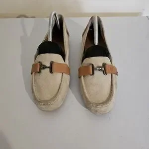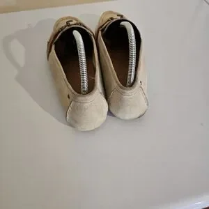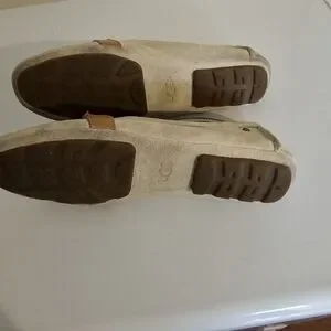 Stylish beige suede Ugg loafers featuring a tan strap with metal detail. Perfect for casual or formal wear.defintly worn but plenty of life left .smoke free home
