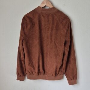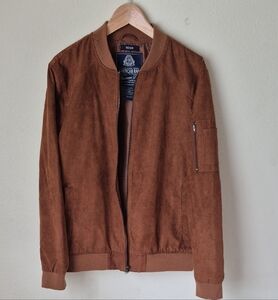 This American Rag bomber jacket in a rich brown hue combines classic style with modern comfort. Crafted from a suede-like material, it features ribbed cuffs and waistband for a snug fit. Its minimalist design makes it a versatile addition to any casual wardrobe.