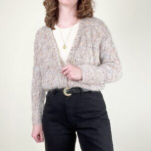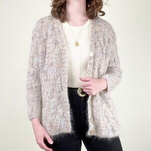 Embrace cozy elegance with this beautiful vintage hand-knit cardigan, showcasing a unique cable knit texture in a soft, fuzzy material that feels like a mohair-wool blend. Interior is also lined for added comfort. Its warm, fun speckled tone and classic button-down front make it a versatile and timeless piece