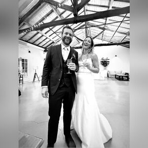 Worn for my wedding and absolutely loved how this dress made me feel! Minimal alterations just took the top and waist in slightly from the original size 8, and added a bustle. The length is the original. I am about 5'8" and wore 2" heels, it was just a smidge too long on me. I am approximately a street size 4, there is a bit of stretch to the fabric but pretty well fit. Ivory color, comes with removable sleeves. Hoping for someone to give it a second life!