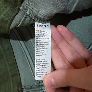 Spanx Stretch Twill Cropped Wide Leg Pant Green. Button details. Back flap pockets. Pull on, elastic waist.