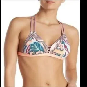 Dive into style with the Maaji bikini top, featuring a vibrant pink and purple tropical print. This chic triangle top boasts double straps and a solid band for a secure fit. Perfect for making a splash at the beach or pool.