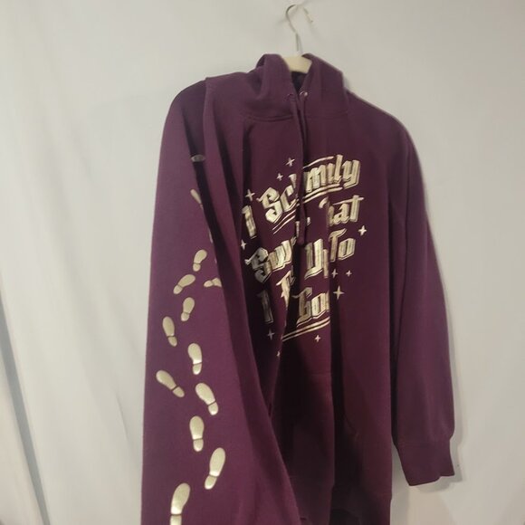 This burgundy sweatshirt has the phrase,"I solemnly swear that I am up to no good" emblazoned on the front in silver along with the marauder map footprints going up the right arm from cuff to shoulder.