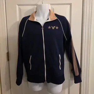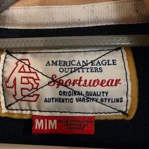 Sporty and retro-inspired, this American Eagle Outfitters men’s jacket is perfect for layering. Designed in navy blue with tan contrast details, white piping, and striped sleeves, it features zippered front pockets and a full zip closure. Embroidered stars and eagle graphic on the chest add a bold varsity-inspired touch.