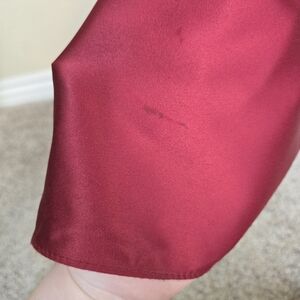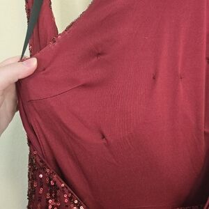 B. Darlin women's red sequin halter top side slit maxi dress gown size 3/4 junior. In fair preowned condition, there are several pulls and damage to the bottom of the dress, but they are not as visible when worn. Hemming the dress would also get rid of a lot of the wear. Please see the pictures for more detail.