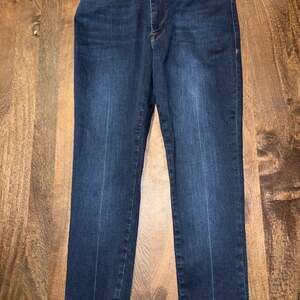 FRAME Le One Skinny Jeans offer a comfortable and stylish fit, designed to adapt to your body. These versatile dark-wash jeans feature classic five-pocket styling and gold-tone hardware. The innovative stretch fabric provides flexibility while maintaining a flattering skinny silhouette. Perfect for everyday wear, these jeans pair well with a variety of tops and shoes. Excellent pre-owned condition, with no visible flaws or significant wear.