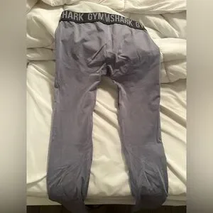 Stylish Gymshark leggings in a soft lavender shade. Features a bold black waistband with logo detail.