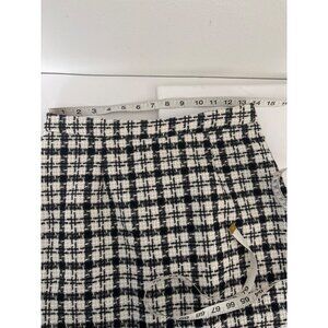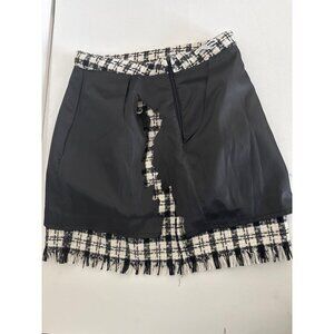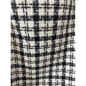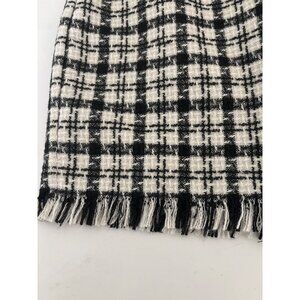 Preppy Tweed Plaid Skirt Large Mini Black & White Checkered Fringe Hem Classic