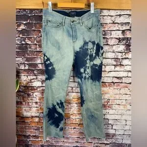 Stylish stretchy comfy blue tie-dye jeans. A mid rise, bootcut style with a raw hem. A hippie boho style.