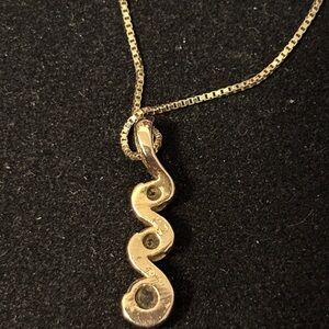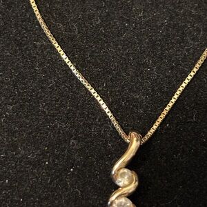 Beautiful 14k yellow gold 3 stone pendant w 14k gold chain. This is in amazing condition only worn a few times. The chain is approximately 18” long as shown in photo. Three CZ stones in a swirl like pattern pendant with stamping on the back side. Chain stamped as well. Comes from a smoke free home.