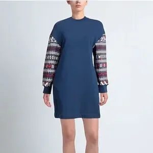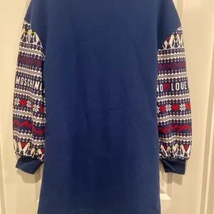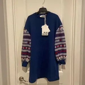Tags: Moschino logo dress, Moschino blue sweater dress, Moschino fair aisle dress, blue sweater dress, fair aisle sweater dress