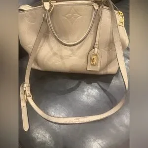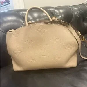 Chic Louis Vuitton satchel in taupe. “Turtledove” color. Features iconic embossed pattern, Monogram Empreinte Leather. Stylish and versatile. Please look at photos. Bag was loved and has some normal wear. Color is most accurate in model photo as well as photo with close up of the lock. Comes with box and dust bag!