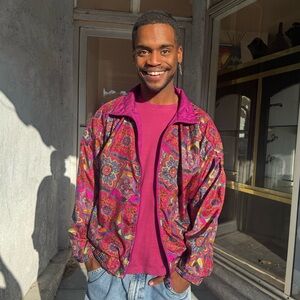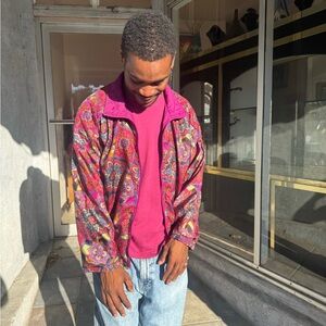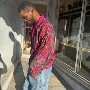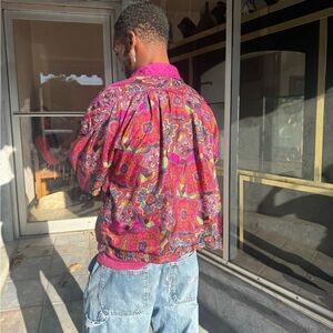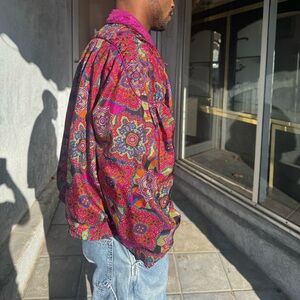 Vintage Lavon by Cheerful Corp quilted statement jacket featuring a bold kaleidoscopic paisley pattern in rich jewel tones — magenta, teal, orange, and gold. Fully lined in vibrant satin magenta with lightweight polyester fill for warmth without bulk. Front zipper closure, elastic cuffs, and hip pockets.