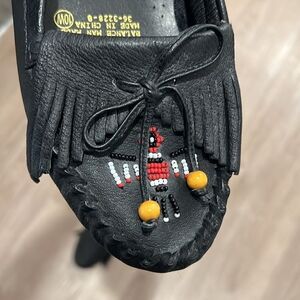 Moccasins with leather uppers. Indigenous / Native beading and design. Fringe with bow. Cushioned insoles. Sizing on shoe is label as a 10W