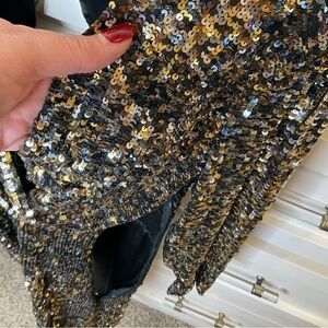 Silver/gold/black sequins. Front slit , gathered waist design