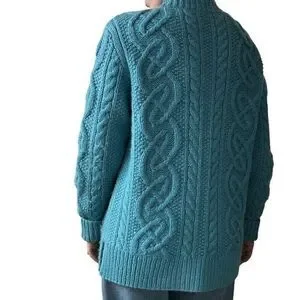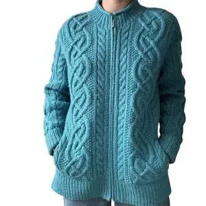 Vintage Womens Teal Blue 100% Wool Chunky Fisherman Celtic Cardigan Sz L