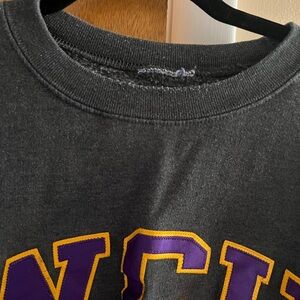 Comfortable gray sweatshirt featuring bold purple and yellow WCU letters for West Chester University. Tag was cut out, but it is a men’s medium. Perfect for fall strolls through campus! 🐏