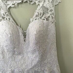 Introducing the NWT Hebeos white wedding dress, a stunning and elegant choice for any bride-to-be. This dress is designed with intricate lace detailing, adding a touch of romance and sophistication to your special day. The dress features delicate buttons and appliques, enhancing its overall charm and creating a timeless look.