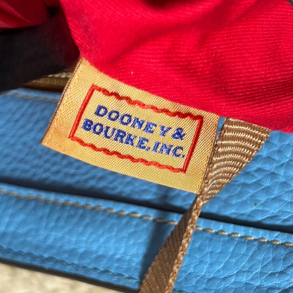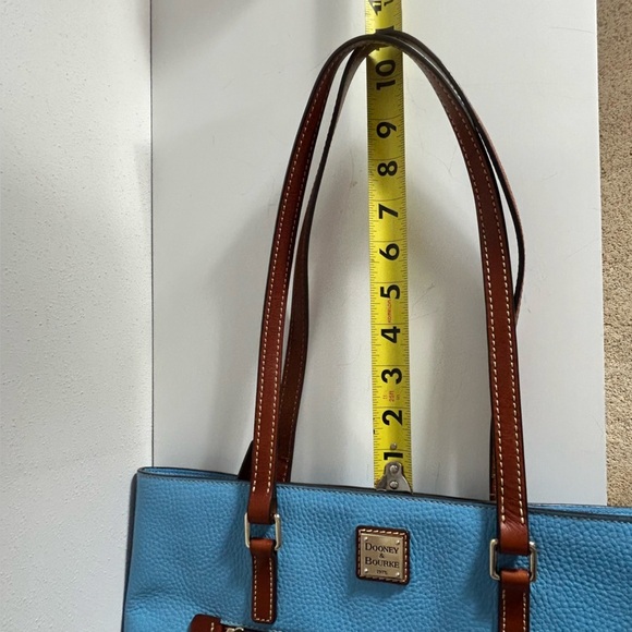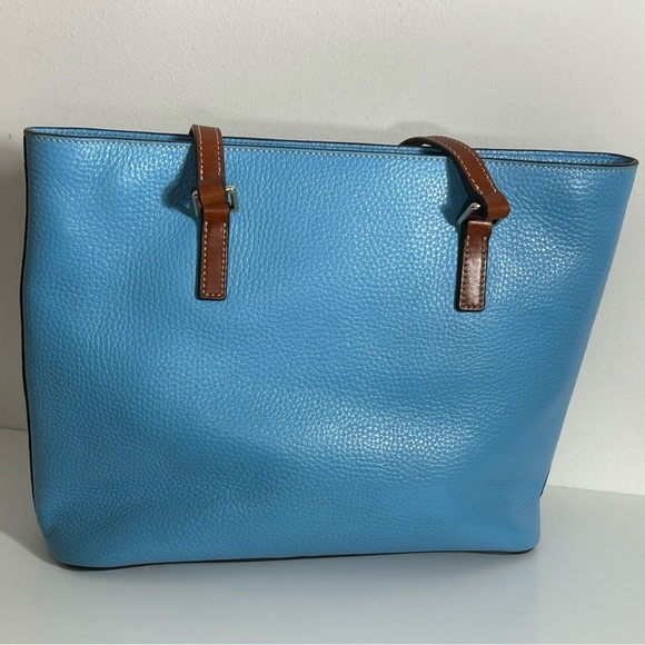 Elegant Dooney & Bourke pebbled blue leather tote with brown leather straps. Features a convenient front zipper pocket.
