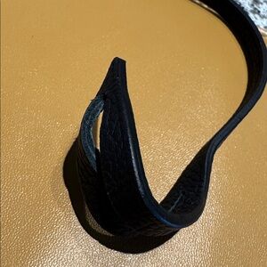 Black leather pochette strap. Never used— but this may have minor imperfections not observable from storage. About 13 inches in length from clasp to end