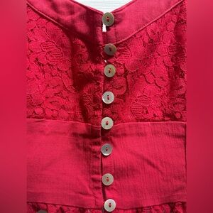 ~Featuring eyelit lace ruffle hem, corset buttons, sleeveless, cropped, bright pink/ red color, lace detail throughout