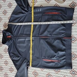 Puma activewear set featuring a charcoal jacket and pants with neon orange details. Perfect for workouts.