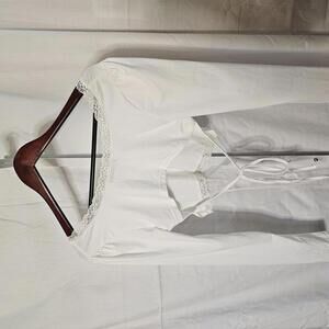 Elevate your wardrobe with this chic white long sleeve crop top featuring delicate lace trim. Perfect for any occasion, this versatile piece can be paired with high-waisted jeans or a skirt. - Feminine v-neck design with lace details - Soft, breathable fabric for all-day comfort - Adjustable tie at the waist for a customizable fit - Long sleeves for added elegance - Ideal for layering in cooler weather or wearing alone during the warmer months.
