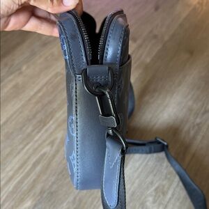 Elegant blue shoulder bag with classic monogram design. Features adjustable strap for versatile wear.