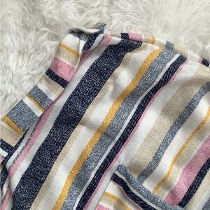 Cute button down from Eden and Olivia. Blue, pink, and orange stripes. Front pockets, tie front. Collared, cuffed cap sleeves. Super cute top with jeans or tied open with a black dress.